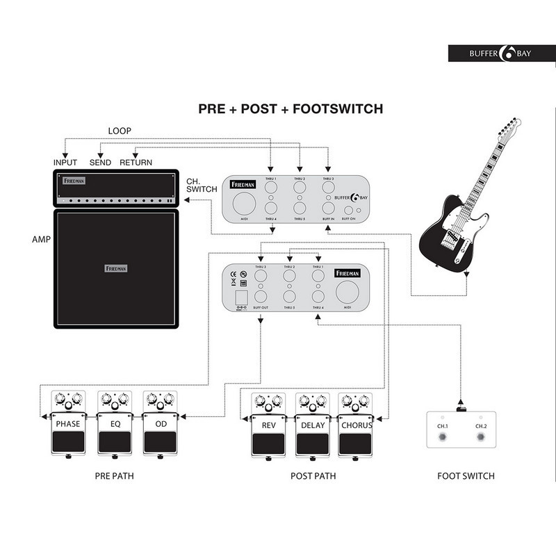 FRIEDMAN BUFFER BAY 6 - педаль буфера / патчування, виключно прозорий і музичний звук, 5 х 1/4" TRS на кінець вхідних виходів, буферний вхід 1/4" TS (з вимикачем вмикання / вимикання), 7-контактний на кінець виходу midi, центр мінус живлення 9B (адаптер не включений).