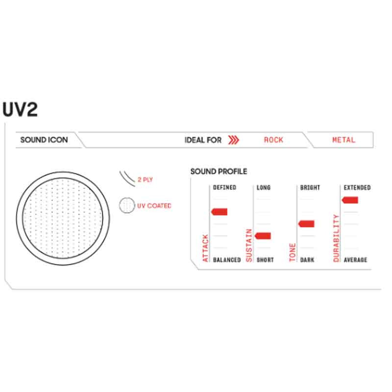 Пластики UV2 складаються з двох щільно стислих шарів екстра міцної плівки, товщиною 7mil кожен. Для забезпечення видатної надійності, вони посилені запатентованим особливим ультрафіолетовим покриттям. Поверхня UV2 забезпечує чудову ударостійкість і тональну цілісність - на весь безпрецедентно довгий термін їх служби. Ідеально підходять для рок і метал музики!
