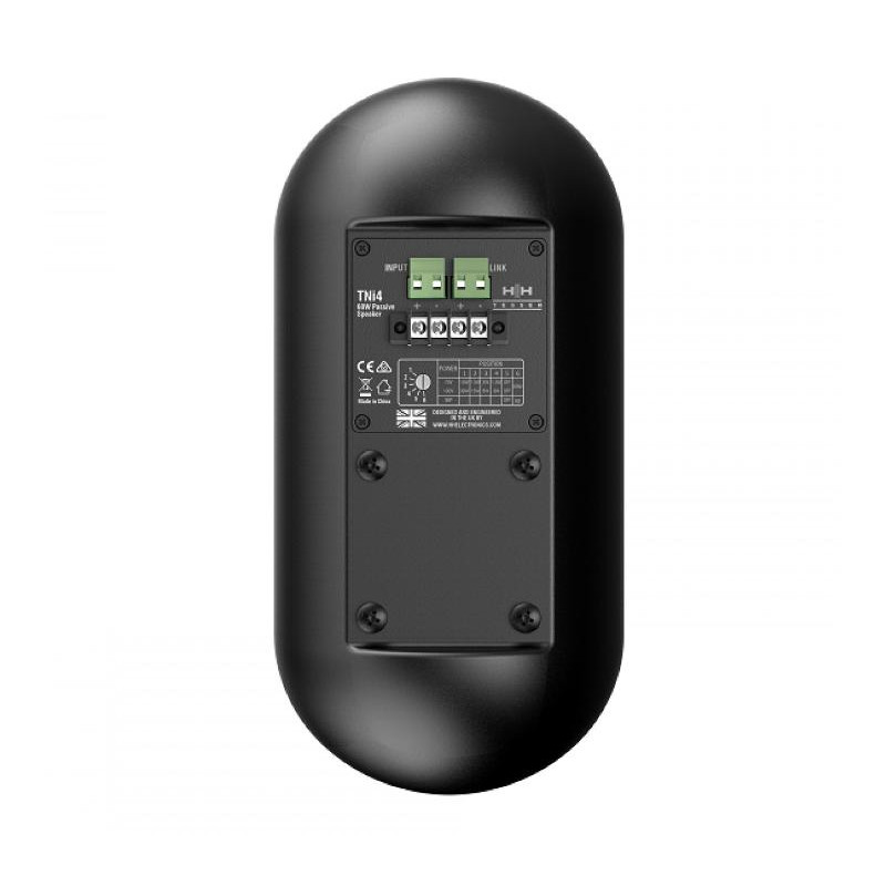 HH ELECTRONICS TNI-W4-BK - Настінна акустична система 4" двосмугова, 80 Гц - 20 кГц, потужність на 8 Ом - 60 Вт (RMS), потужність на 100 В - 30 Вт, 15 Вт, 6 Вт, 3 Вт, потужність при 70 В - 15 Вт, 7,5 Вт, 3 Вт, 1,5 Вт, 1,5 Вт. ВЧ - 4", ВЧ - 1", чутливість (1 Вт / 1м) 88 дБ, SPL max (PEAK q1 m) - 106 дБ, кут відкриття (1 кГц) - 90 х 90 градусів, вхідний роз'єм / LINK - Накладки euroblock і M4, чорний пластиковий абс кузов, металева сітка, поворотне кріплення в комплекті, розміри - 295 мм (В) х 145 мм (S) х 222 мм (G), вага 2,8 кг.