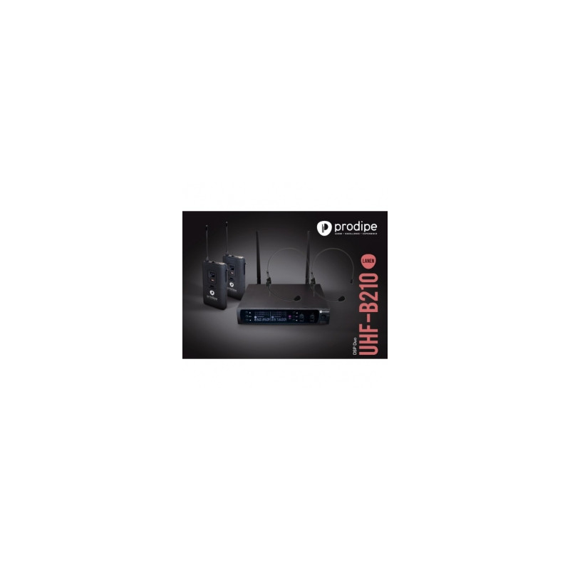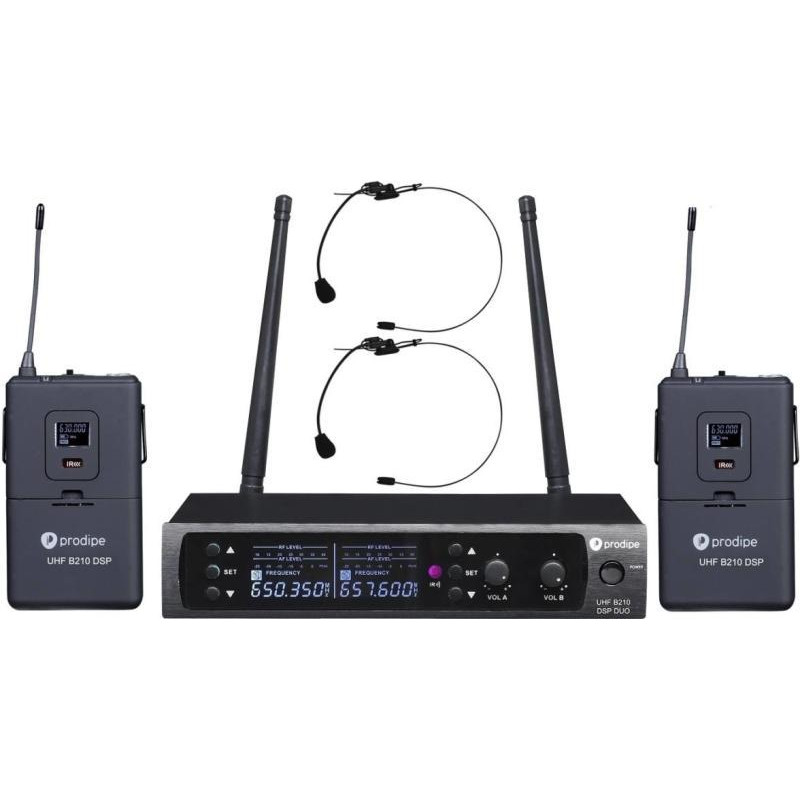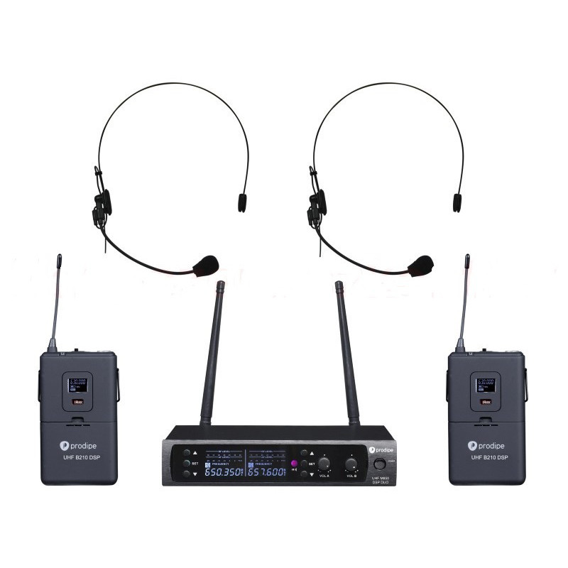 PRODIPE UHF B210 DSP HEADSET DUO - вокально-мовна радіо система з 2 ремінними пакетами (beltpack) і 2 без головки непрямими мікрофонами, що працюють в діапазоні UHF. Використання технології DSP (Digital Signal Processor) забезпечує виняткову стабільність сигналу.