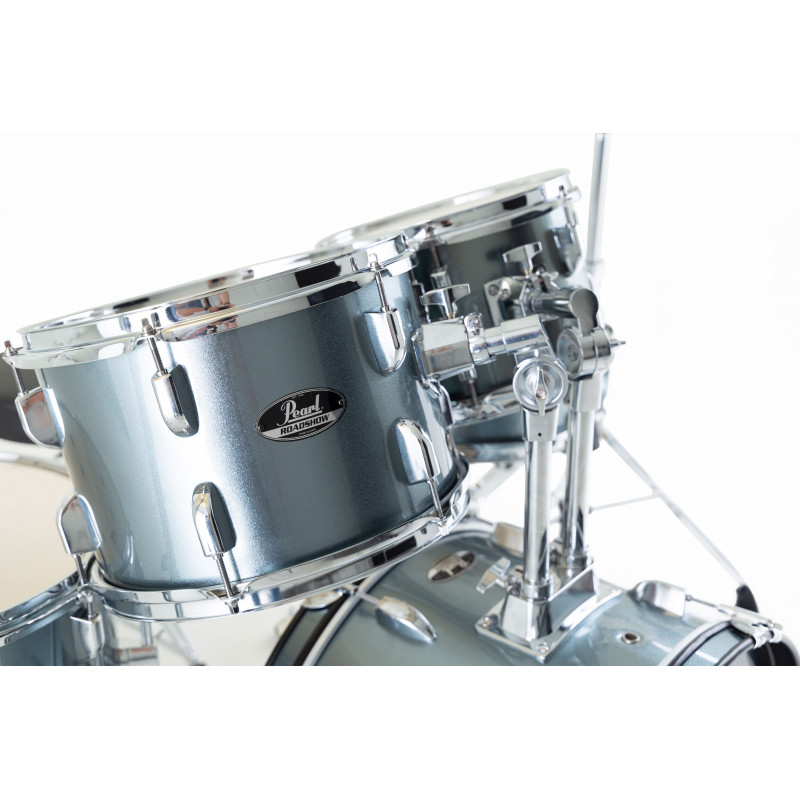 PEARL RS-525SC/C706 - Strike Installation, Roadshow Series (2216B, 1008T, 1209T, 1616FT) з 9 шаруватими футами. У комплекті - стійка для барабана з пасткою, стійка з високим капелюхом, пряма стійка під тарілкою, педаль, стілець, дерев'яний барабан для 14"x5,5", набір тарілок Pearl (хай-капелюх 14", crash/ride 16"), барабанні палички, корпус для барабанних свічок. Колір обкладинки - деревне вугілля metallic.