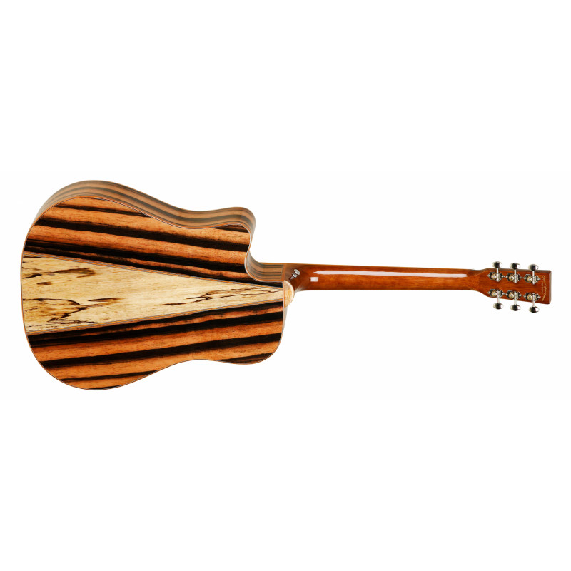 Форма корпусу Cutaway Dreadnought відома своїм сміливим і виразним характером, забезпечуючи насичене звучання, що ідеально підходить для різних музичних жанрів і стилів гри. Ця конструкція не тільки забезпечує потужну акустичну проекцію, але й забезпечує легкий доступ до високих ладів, що робить її придатною для сольних виступів та виконання соло.
