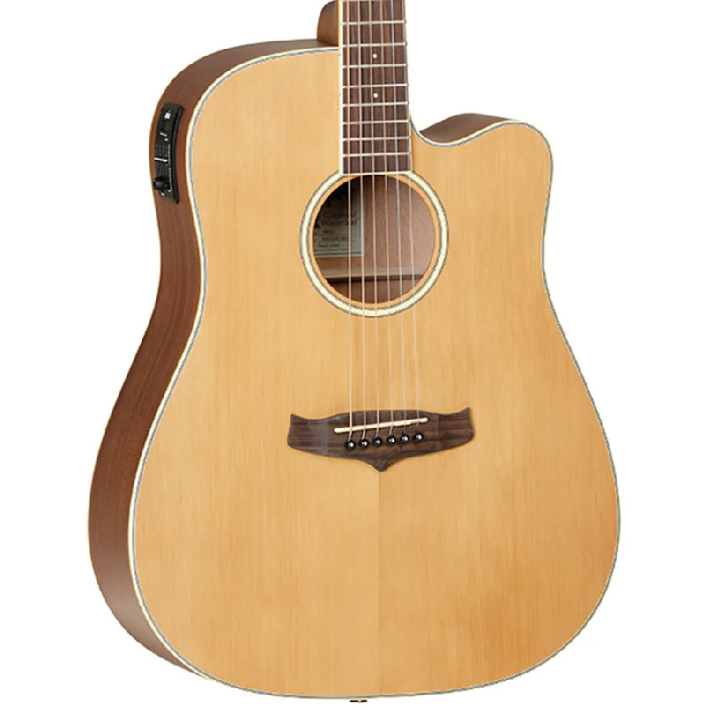 Tanglewood TW5CE NA - електроакустична гітара, що поєднує в собі класичний дизайн і видатні тональні характеристики. Завдяки формі корпусу Cutaway Dreadnought, ця гітара має як нестаріючий зовнішній вигляд, так і легкий доступ до верхніх ладів, що робить її чудовим вибором для музикантів, які цінують як стиль, так і універсальність.