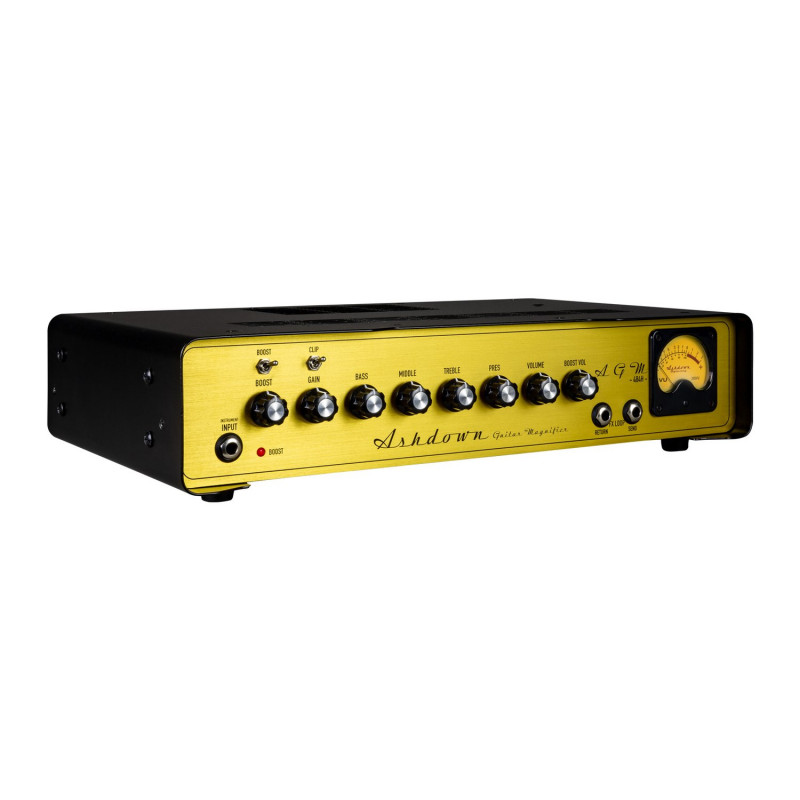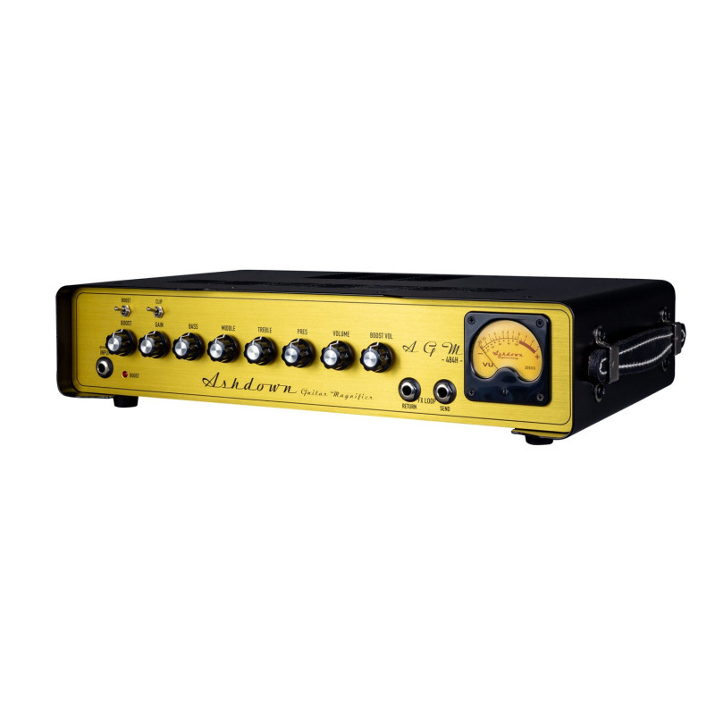 ASHDOWN AGM-484H - підсилювач лампи для електрогітари, ручна збірка в британському митному магазині, потужність 30 Вт від 4 ламп JJ Electronics EL84, педалі перемикача Boost, посилення і контроль рівня, 4 лампи для попереднього підсилення JJ Electronics ECC83, 4 ступені каскадного посилення від соковитого чистого звуку до фатального перевантаження, Кліповий тумблер змінює рівень підсилювача вхідного сигналу, контроль низьких, середніх, високих частот і наявності (присутності), компонентів військового рівня, ефектів контуру лампи, виходу VU Meter, виходів 8/16 Ом для різних шаф, в суперкомпактний сталевий корпус з вентилятором, розмір: 400 мм х 80 мм х 220 мм, вага: 12 кг.