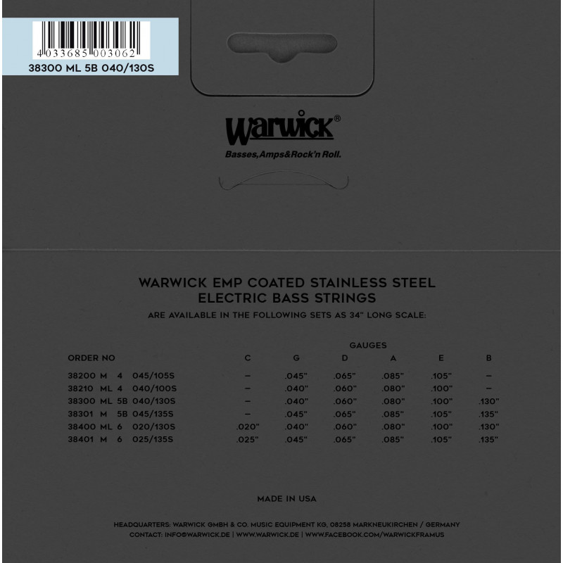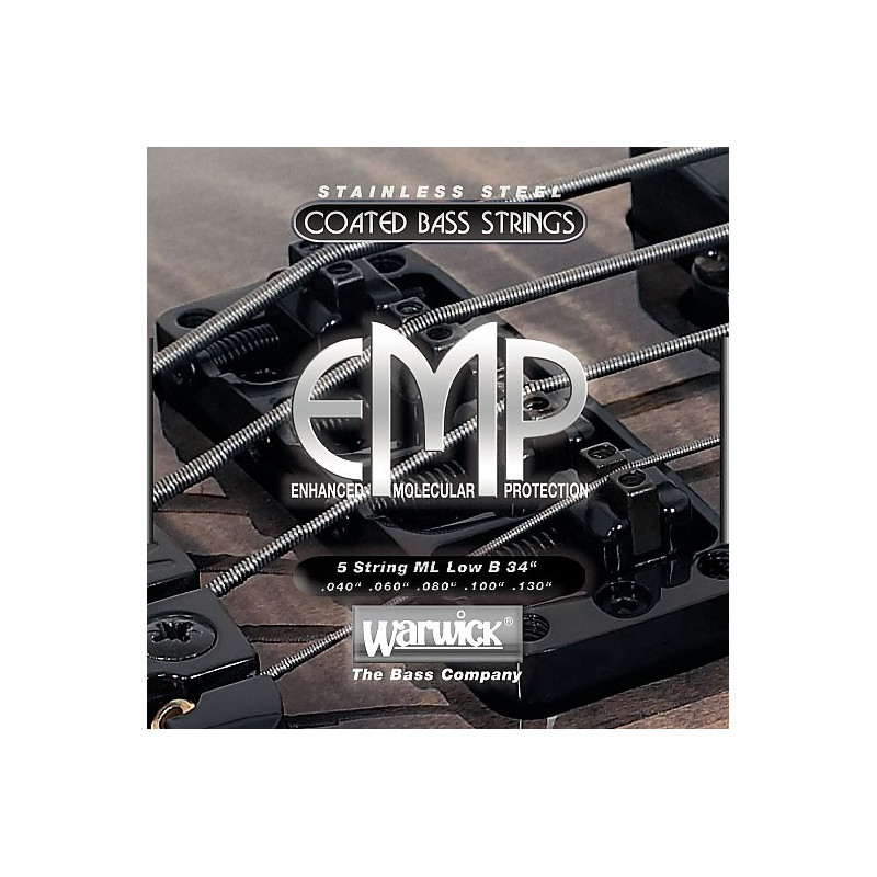 WARWICK 38300 EMP Medium Light 5-String (40-130) - 5-струнний бас-гітарний набір, нержавіюча сталь, (.040".060".080"100"130"). Чорні етикетки струни зі спеціальним покриттям EMP (Розширений молекулярний захист), що в кілька разів збільшує термін служби і покращує звук.